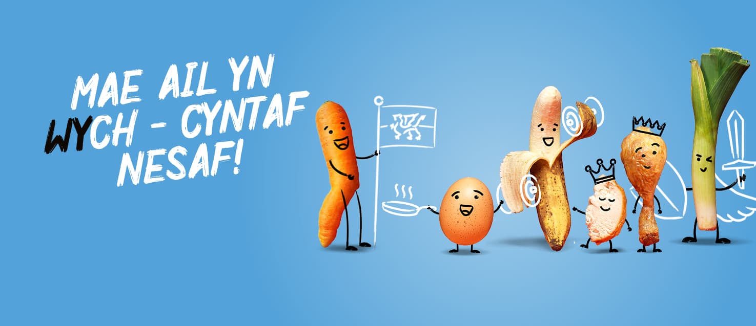 Wyddost ti? Mae gwastraff bwyd a gaiff ei ailgylchu yng Nghymru yn cael ei droi'n ynni adnewyddadwy – gall ailgylchu un croen banana yn gywir helpu i gynhyrchu digon o ynni i wefru dau ffôn clyfar!